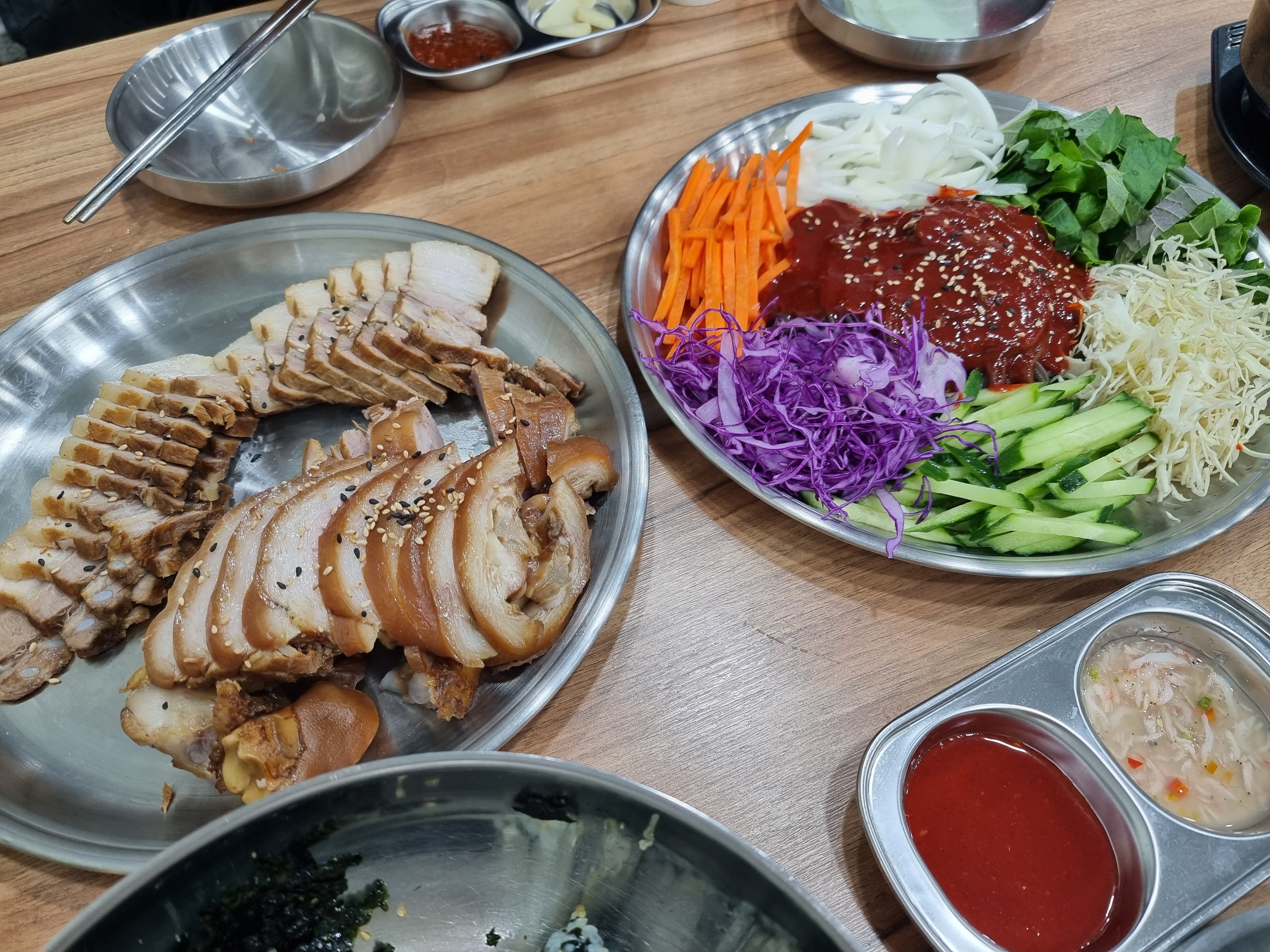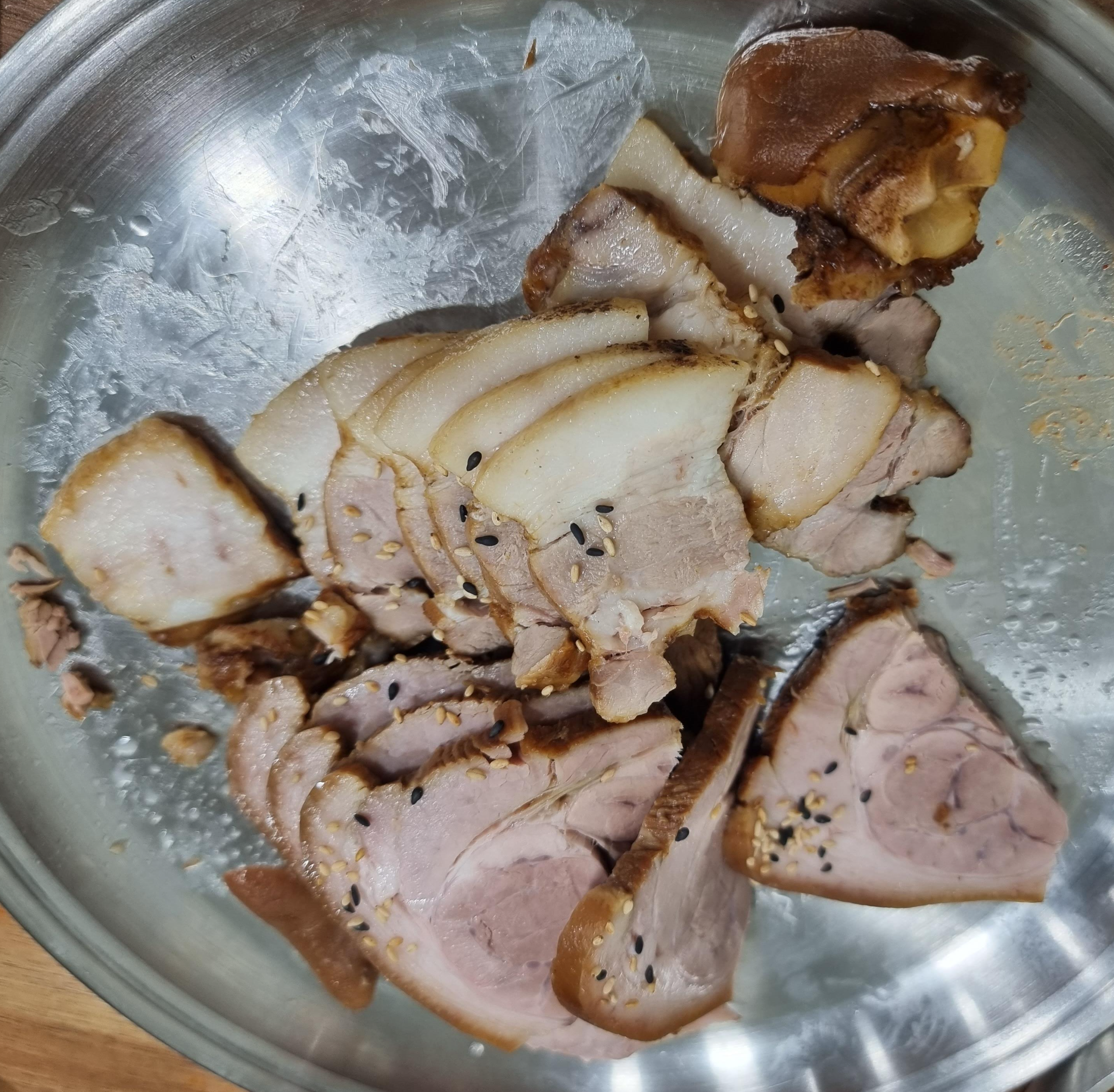 - 족발은 시장족발 같은 느낌. 나는 시장족발 짱 좋아하는 편이라 좋았음. 약간 식은채로 나왔는데 껍질 부분도 맛있고 고기도 부드러운 편. 고기 냄새에 조금 민감한 편인데 보쌈에서도 냄새 안나고 부드럽고 괜찮았음. 다만 리필할때 나오는 보쌈은 첫번째 나오는 보쌈보다 확실하게 비계 부분이 더 많아서 아쉬웠다.