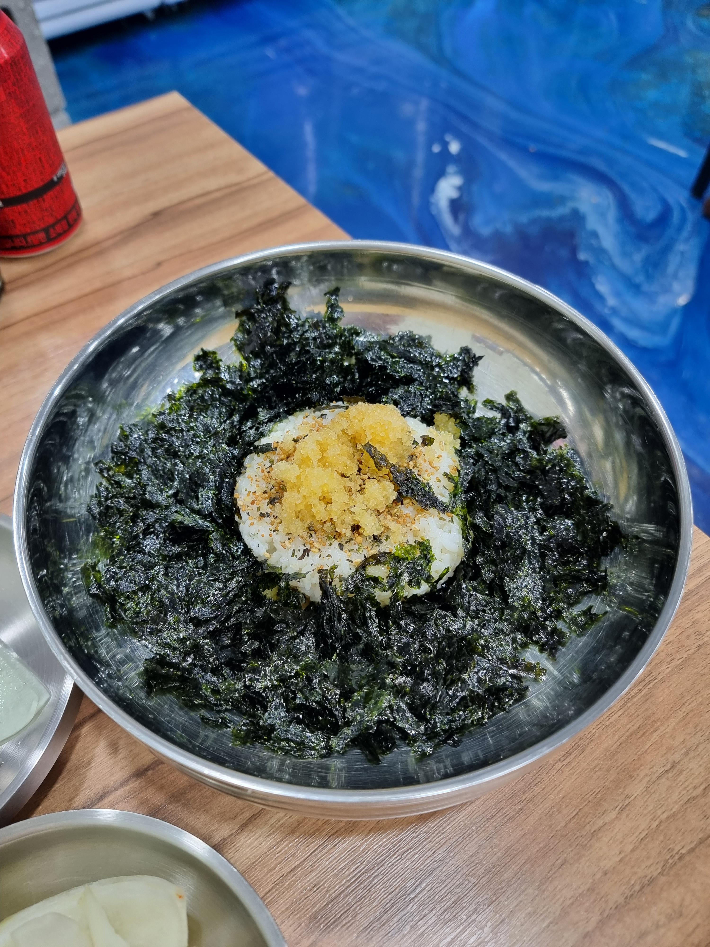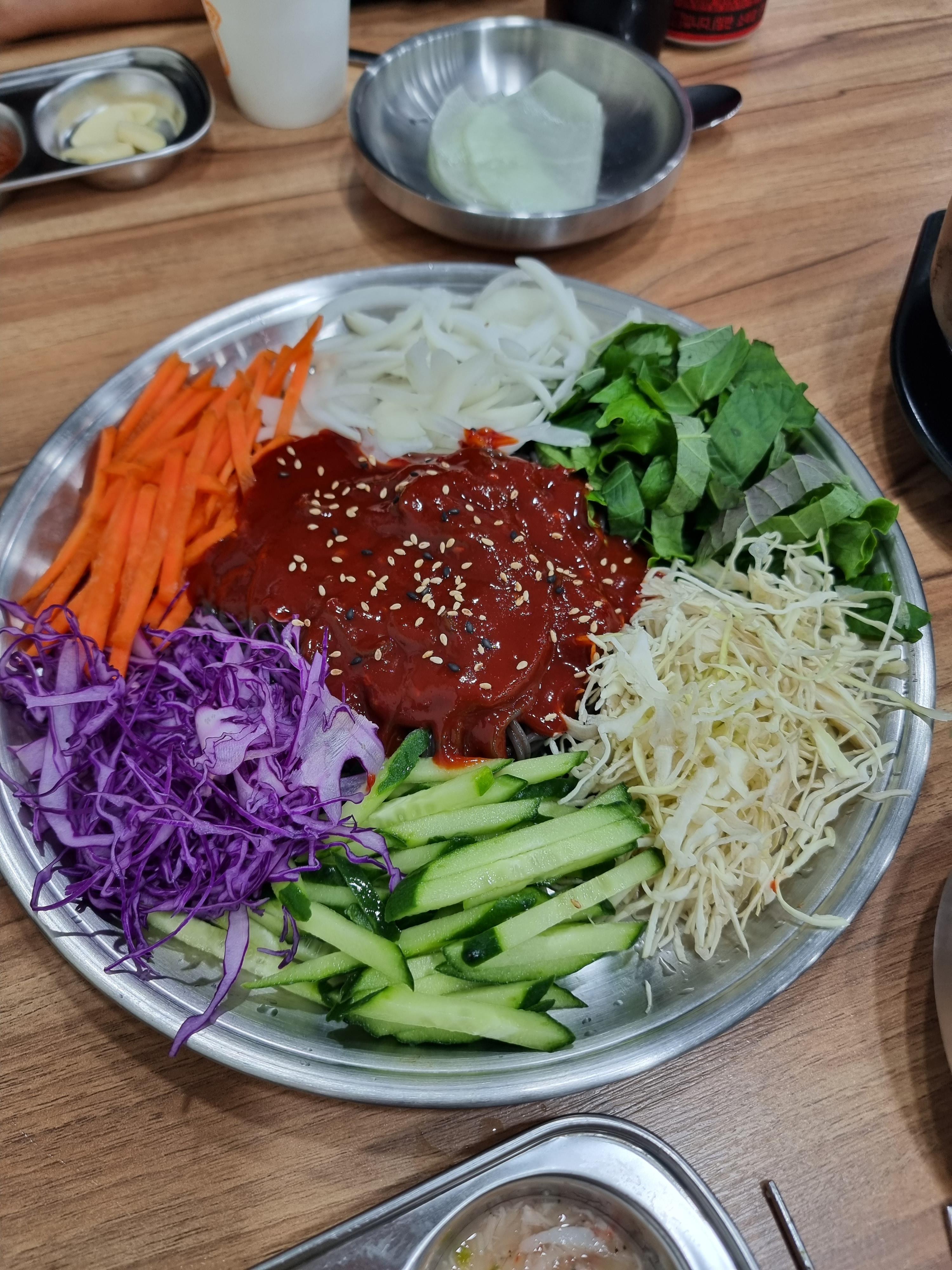 - 막국수와 주먹밥을 주문해서 먹었는데 주먹밥은 쏘쏘, 막국수는 솔직히 많이 별로였다 ㅠㅠ 매운맛... 캡사이신 맛 밖에 안나서 많이 아쉬웠다. 야채도 엄청 많고 면도 쫄깃해서 소스만 좀 맛있게 하면 괜찮을거 같은데.....