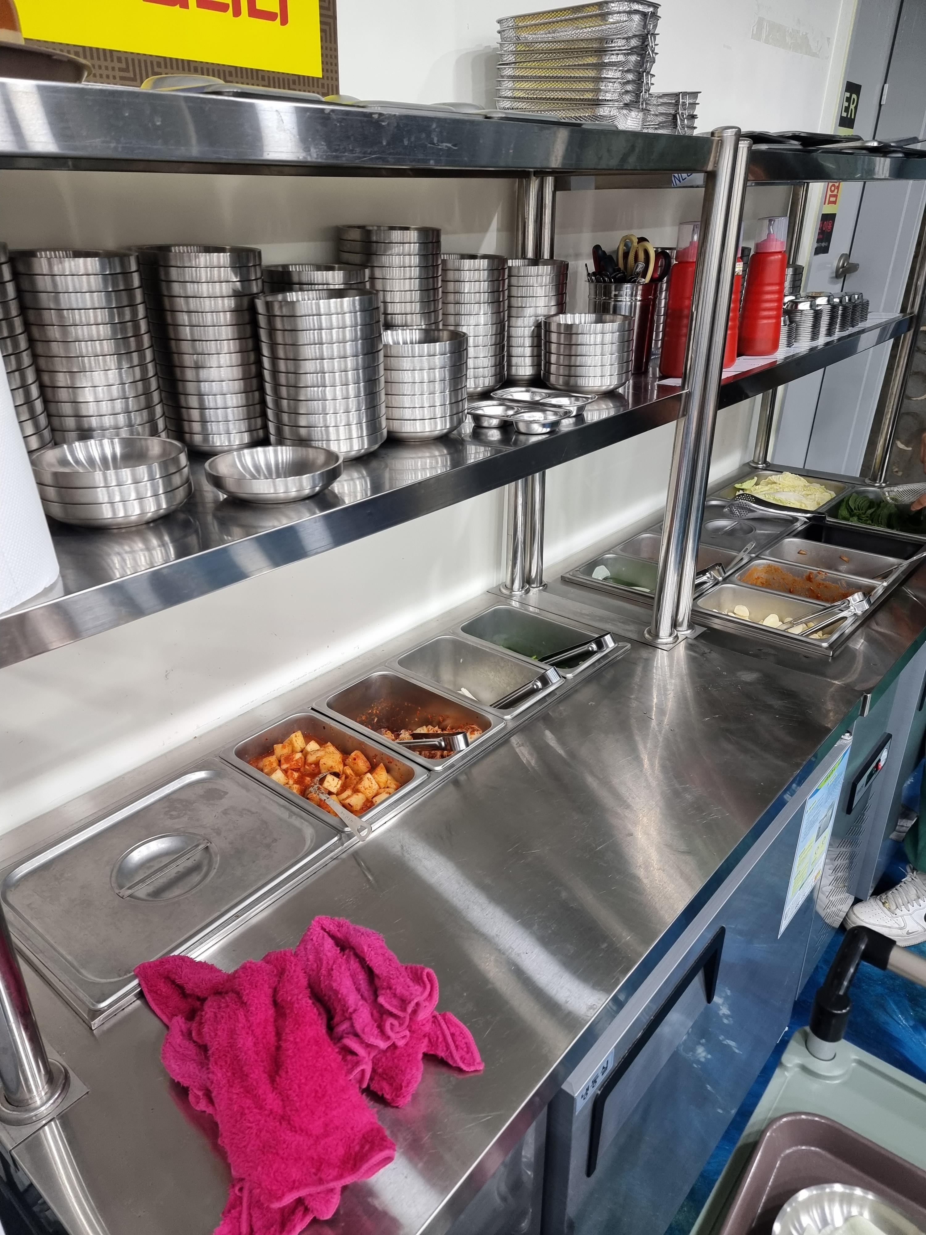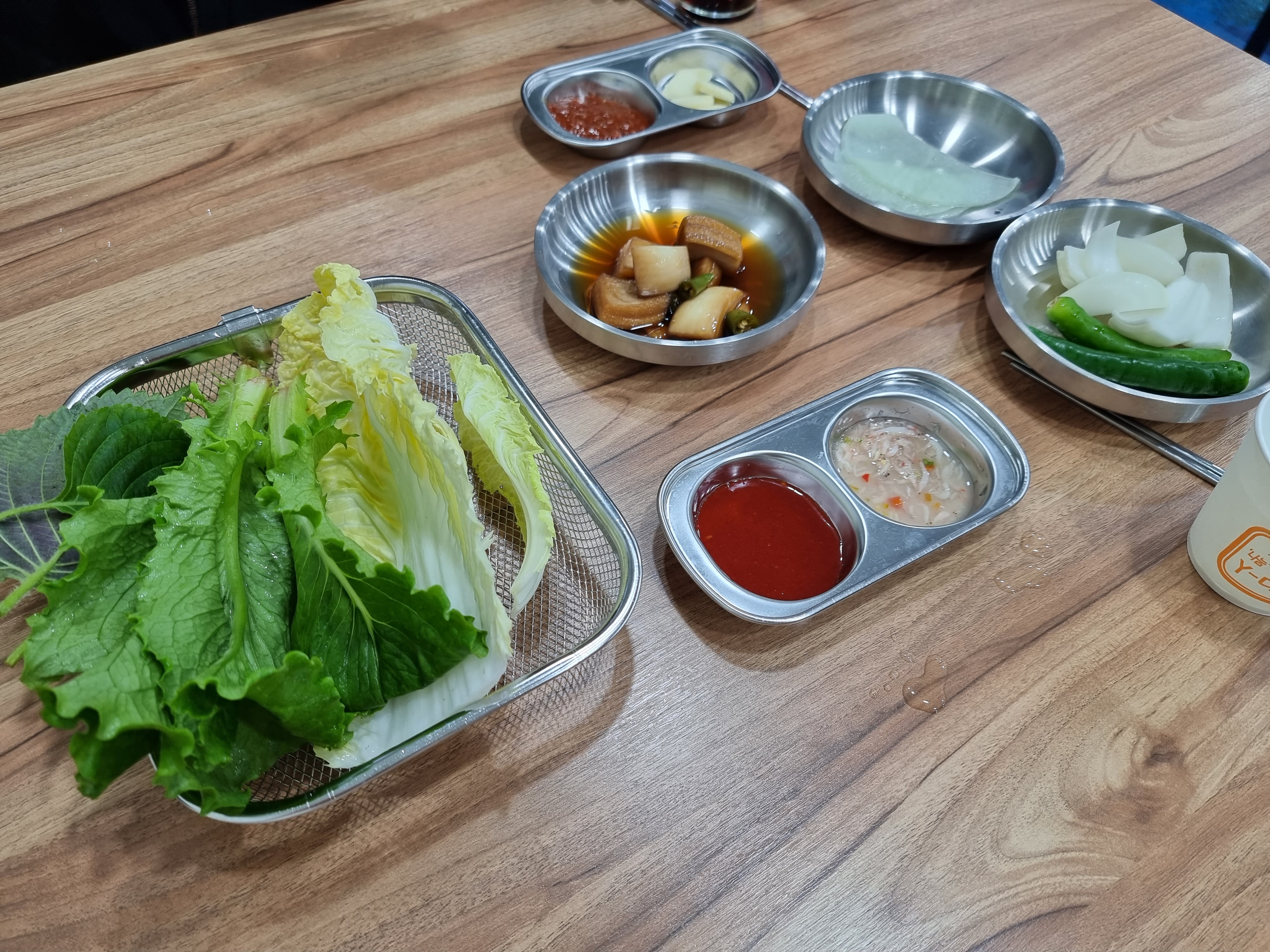 - 상추, 깻잎, 배추, 양파, 마늘, 쌈무, 쌈장, 초장, 새우젓, 양파절임, 청양고추는 처음에 세팅해주고, 부족하면 셀프코너에서 더 가져다 먹으면 됨. 앞접시도 필요하면 셀프코너에 있고, 깍두기와 배추김치도 셀프코너에 있다. 김치는 처음에 안가져다 주니까 필요하면 가져다 먹기. 참고로 보쌈김치는 기본찬에 포함되지 않고, 6천원에 주문해야한다. 난 셀프코너에 김치가 있기에 따로 보쌈김치는 추가하지 않았다.
